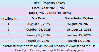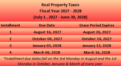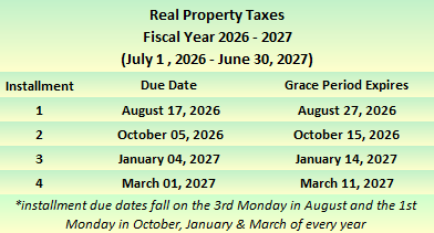 Tax rates are set in June of each year. Tax bills are prepared and mailed out by August 1st of each year. Property taxes are due on the third Monday in August. However, the property owner may elect to pay installments if the taxes on a parcel exceed $100.00.